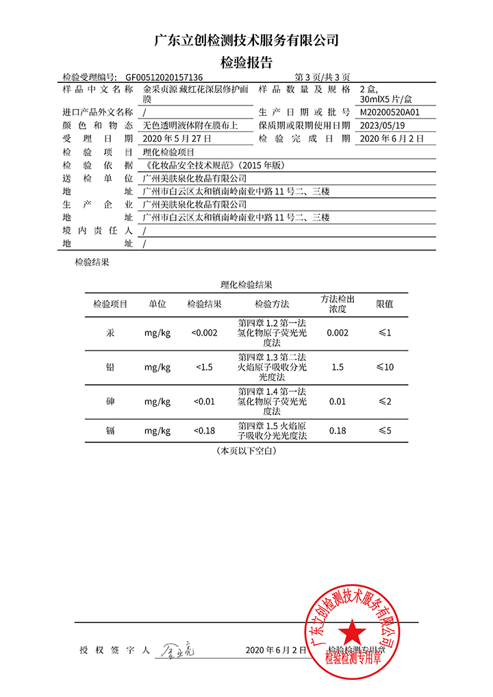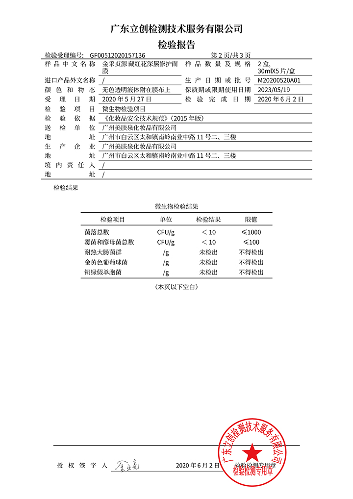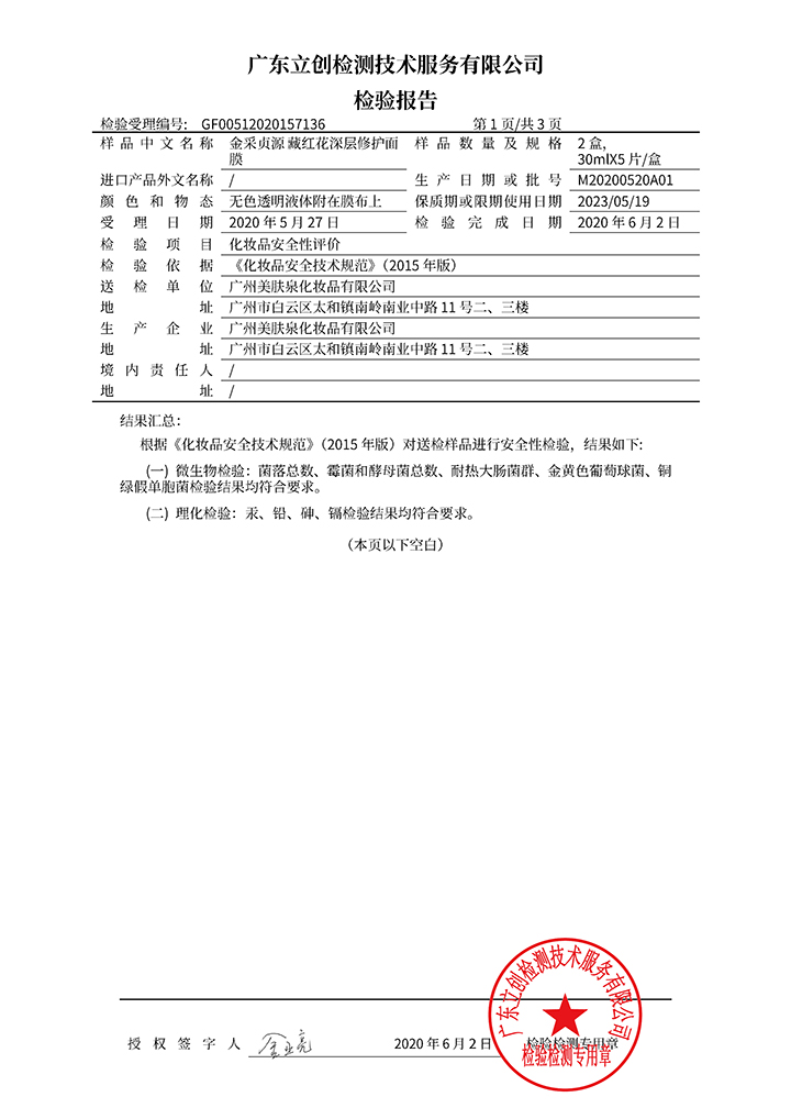 藏紅花深層修護(hù)面膜檢驗(yàn)報(bào)告